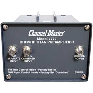 The Channel Master CM 7777 is a high gain, low noise preamplifier used for weak signal areas to allow a weak signal that is present at the antenna to be amplified to a viewable strength. This TV antenna preamplifier works best for persons in weak signal areas and is subject to overdrive if used in areas with fairly strong signals. In stronger signal areas our medium gain preamplifier, the CM 7778 is a better choice. General Information-Manufacturer-PCT International, Inc:General Information-Manufacturer Part Number-CM-7777:General Information-Manufacturer Website Address-pctinternational:General Information-Brand Name-PCT International: General Information-Product Name-CM 7777 Titan2 Signal Amplifier: General Information-Product Type-Signal Splitter/Combiner